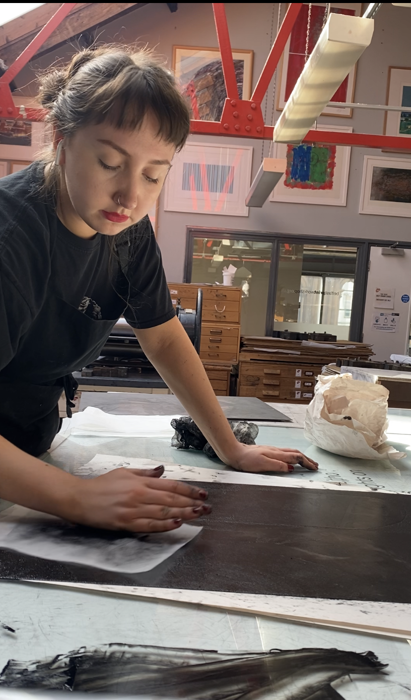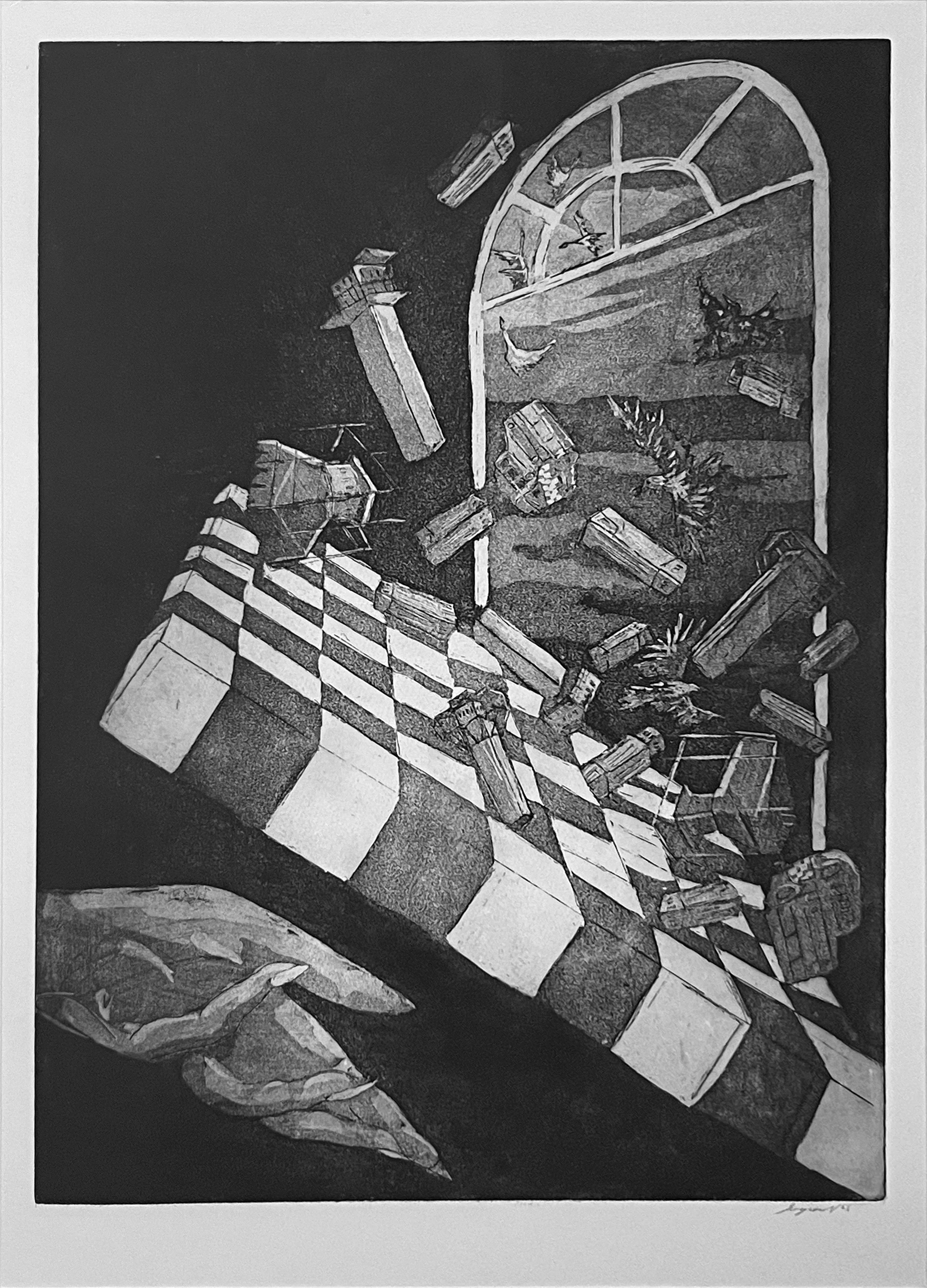 Most recently, the artist has used etching to explore the tension between urban landscapes and Celtic mythology. The viewer is asked to consider the contrast between the earthbound chill of concrete and steel with the warmth of feathers in flight.